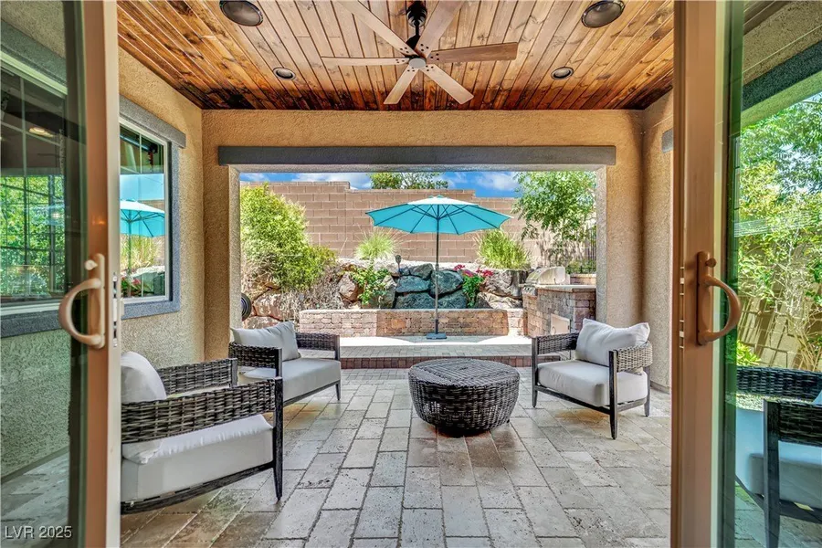 Discover this beautifully updated retreat nestled within a quiet, gated enclave showcasing breathtaking Black Mountain views. This 4-bed, 3.5-bath home has been thoughtfully upgraded inside and out — from the fresh exterior paint and lush landscaping to the backyard oasis featuring a rock wall, travertine pavers, built-in BBQ, and a covered patio with custom wood ceilings. Enjoy seamless indoor-outdoor living with surround sound, built-in speakers, and dual sliding doors opening to the serene outdoor space. The chef’s kitchen offers quartz countertops, GE Profile appliances, an oversized island, and a walk-in pantry. The bright, open living areas feature 10-ft ceilings and electric blinds. Upstairs, the spa-inspired primary suite includes a soaking tub, stunning walk-in shower, and custom closet. With spacious secondary bedrooms and private bath access, this floor plan is perfect for guests or multi-gen living. Every detail creates a peaceful, move-in-ready home you’ll love home to.