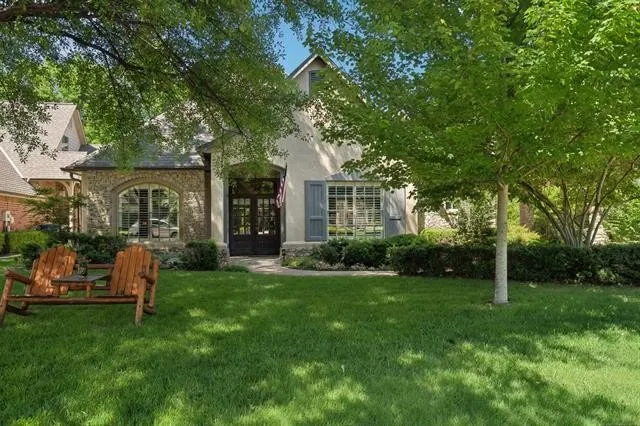 OPEN HOUSE SUNDAY- 1pm-3pm! Nestled in Tanglewood Estates in South Tulsa and the highly sought Jenks School system this 4 Bedroom Country French home is full of style and charm with extensive hardwood floors, custom cabinetry and mill work, dual entry staircase and porte cochere. The open floor plan has a culinary center island kitchen with stainless appliances, plenty of prep space and an impressive walk-in pantry. A rounded breakfast nook with stone accent wall leads to the side patio perfect for morning coffee or just relaxing. The spacious family room with fireplace opens with French doors to a multi level composite deck and landscaped lawn with open views. A private office is perfect for working at home with built-ins and plenty of natural light. The first floor primary suite accommodates large furniture and has a spa style bath with dual sinks, separate tiled shower and jetted tub. There is an additional bedroom on the entry floor with sitting area and private bath. Upstairs a huge game room feeds to two bedrooms, both with large closets and a hall bath. Easily accessed attic storage. Upgraded throughout with dual water heaters-one tankless, newer carpet and paint, 2 hvac systems approx 2 years old, 3rd hvac system is newer, roof approximately 18 mos. 3 car garage with storage, central vac, lush landscaping with full irrigation.