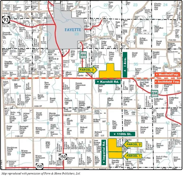 Parcel 3: 153.64 acres, m/l, located on the NW corner of the intersection of Kornhill Rd. and I Ave. Farm has 143.44 FSA crop acres with a CSR2 of 74.27.