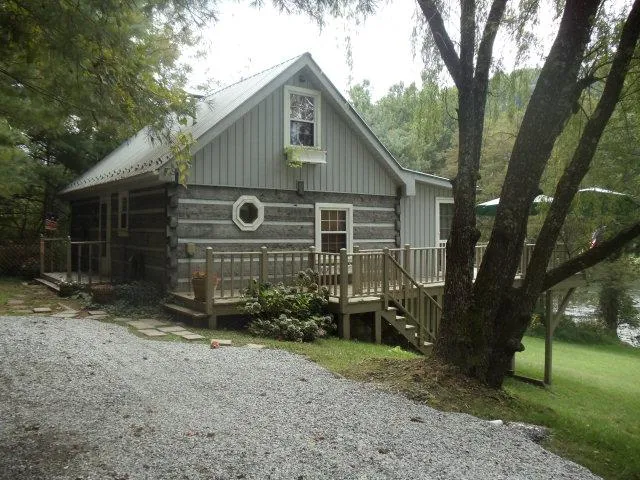 New River waterfront open floor plan cabin/chalet/bungalow/cottage/cape boasting 1140+ SF, private, secluded, peaceful setting, views, easy access. Rock woodburning fireplace hearth, hand hewn beams, wood floors, gorgeous all new kitchen w/stainless appliances. Central HVAC, cozy, warm & welcoming from the first step in the door. Tucked inside the canopy of the trees on 7+ acres, bordered by trees, neighbors are distant, Location like this is tough to find with a gorgeous home priced right on the River. The open wrap around decks provide for more living/entertaining areas. Swing, hammock, firepit location and deck/dock that provides access into the water for fishing, tubing, canoeing, kayaking. Outside unfinished basement entrance provides for all the storage you need to enjoy life on the River. Home is immaculate in all ways. Perfect size for your mountain get a way without all the fuss. Fun times begin here. Come see this one. You're going to like it here.