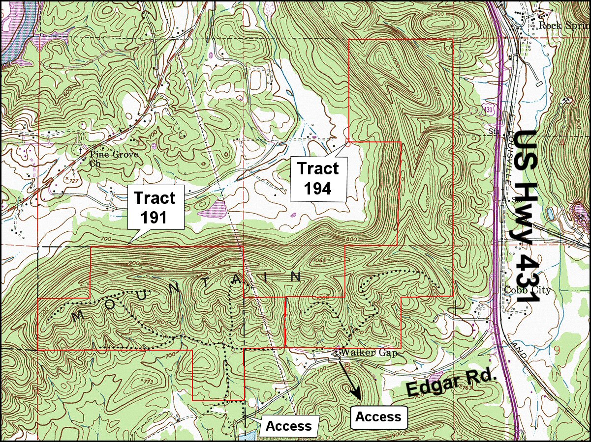 Research Parcel InformationFrom Interstate 20, take Anniston Exit (US Hwy 431 North) and go north through Anniston on Quintard Ave. Go 6 miles to split of US 431 and AL Hwy 21, and bear left staying on US 431. Go 17 miles crossing into Etowah County to the intersection of Edgar Rd on the left. Take a left on Edgar Rd. and go 4/10 of a mile to a dirt road on the right. Take a right and go 300 yards to a gate on the right that is on the property line.