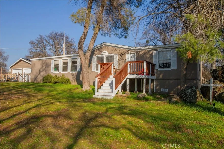 This well-maintained 3-bed, 1.75-bath manufactured home sits on just over an acre of flat, usable land, offering a perfect blend of comfort and tranquility. Equipped with reasonable solar energy and all-electric appliances, this home is both eco-friendly and cost-effective. This home is surrounded by mature oak trees and fertile soil, you'll enjoy the beauty of nature right at your doorstep. The convenient bus stop and mailbox are located at the front of the property, while the home itself is set back from the road, creating a serene and private atmosphere. Step inside to discover an inviting open floor plan with vaulted ceilings that enhance the spacious feel. The cozy wood fireplace is perfect for gathering with loved ones, while ceiling fans and recessed lighting create an inviting ambiance throughout. The large master bedroom serves as a true retreat, complete with a generous soaking tub and an expansive walk-in closet. With plenty of storage options, including a spacious 2-car garage, large mudroom and a small storage room off the kitchen, you'll have all the space you need to stay organized. Location is key, and this home is just minutes away from grocery store, church, gym, banking, pharmacy & hardware store. A short drive further up the road leads to forest access, casinos and multiple lakes, including beautiful Shaver Lake just 13 miles away, offering endless recreational opportunities. Plus, major shopping in Clovis/Fresno is only a scenic 45-minute drive away.