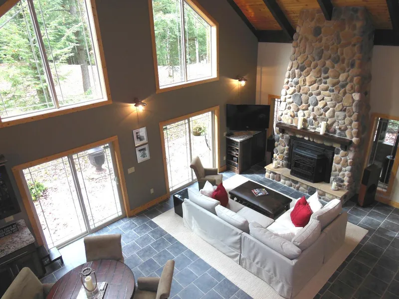 Stunning custom-built executive home nestled in a beautiful wooded setting. A light post lined blacktop driveway leads through the forest to this open concept home, showcasing cathedral ceilings and an impressive floor-to-ceiling fieldstone fireplace. Magnificent kitchen suitable for a professional chef, featuring beautiful Cambria countertops, Sub-Zero and Wolf stainless steel appliances, elegant dark-stained hickory cabinets, as well as stainless steel and Cambria backsplash. Dual-zone wine cellar is perfect to keep your wine collection at proper serving temperature and ready to entertain at a moments notice. Porcelain tile and Teak hardwood floors throughout. In-floor heat on main level of the home as well as in the attached three-stall garage. Tile showers in each bathroom, and shower on main level features Steamist steam bath system. Unwind in the outdoor hot tub or relax in the screened-in porch and enjoy the scenic wooded setting.