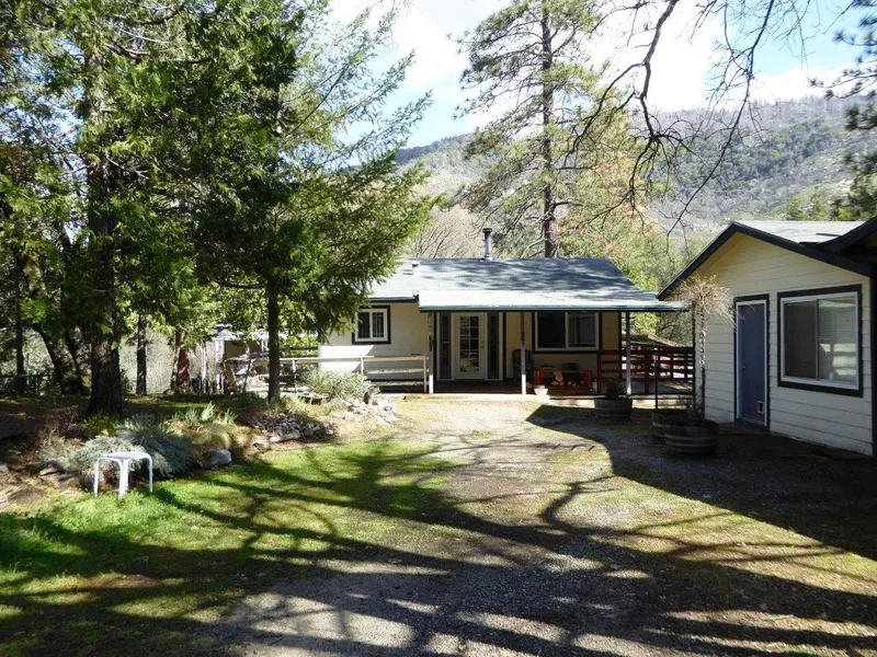 Absolutely beautiful setting with great views! 3.38+/- acres covered in Oaks, Pines and Cedars. Cozy 1 bedroom, 1 bath cottage with hardwood floors and an open concept. Downstairs is a 600+/- sq. ft. garage, workshop, separate laundry room and 3/4 bath. Detached guest room, carport and storage building. Greenhouse, garden area and paved driveway. Nice quiet location!