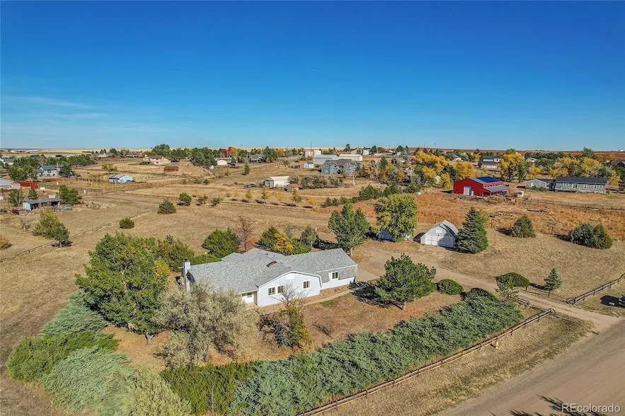 Great location in Prairie View! With potential for up to four bedrooms, this home offers 2,191 square feet, three-car garage, and 24`x22` outbuilding/barn on 2.81 acres. The living room features a fireplace and new carpet, adjacent to the enclosed patio overlooking the backyard and established trees. The kitchen has great cabinet space, double oven, and pantry closet, adjacent to the spacious dining area complete with a bay window. The primary bedroom offers two closets and an ensuite bathroom. Convenient office or 4th bedroom location near front entry. Private lot and expansive road frontage = great spacing between neighboring properties. Enjoy the benefits of living on acreage, with a convenient location and easy commute to Buckley AFB, Anschutz Medical Campus, Southlands Mall, Aurora, and Denver International Airport. Welcome home! ** New roof/shingles 2024 ** New carpet ** Prairie View covenants allow for up to 4 horses ** 33 acres of community owned trails and open space along Box Elder Creek!