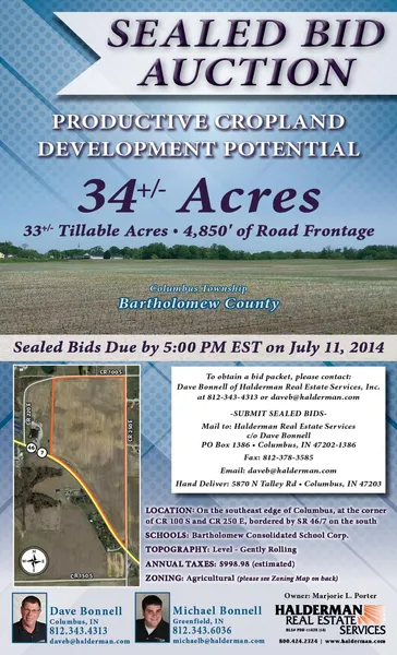 Auction Location: Sealed Bids Due By 5 PM EST To: Halderman Real Estate Services, Inc., c/o Dave Bonnell, P. O. Box 1386, Columbus, IN 47202-1386 or Faxed To 812-378-3585 or Hand Delivered to 5870 N. Talley Road, Columbus, IN. :