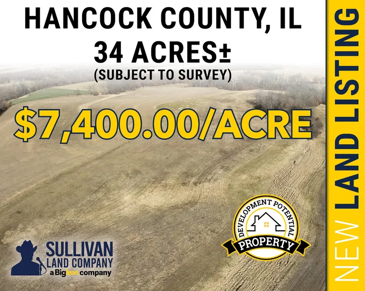 The real estate contains 34 acres (subject to survey) and is located on the West Point blacktop in Hancock County, Illinois. The farm offers productive tillable cropland, CRP income, and excellent building sites.