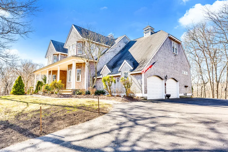 Perched high to capture views of the Atlantic, this custom-built cedar shingle home boasts one of the most serene settings in Charlestown. Sited on three private acres just over a mile from the beach, the comfort, luxury and style of this interior designer’s home are impeccable. An inviting front porch leads into a three-story foyer. The kitchen spans the rear of the house, where natural light spills in from the south facing windows. Equipped with professional grade amenities, custom cabinets and granite countertops, this is the heart of this home. The butler’s pantry leads into the formal dining room, and a living room with wood burning fireplace, an elegant study, and an office/bedroom off the mudroom complete the first floor. The primary bedroom enjoys the best ocean views in the home, with a sitting room, fireplace, walk-in closets, soaking tub, and marble shower. Two additional bedrooms share a bath, and a third is en-suite. The rooftop deck offers breathtaking views of the natural scenery and the ocean beyond. The 1500 s.f. finished lower level with bath is the perfect place for informal entertaining or private lodging for guests. The outdoor space is a true oasis, with a deck off the kitchen for dining and grilling, and a patio and firepit below. The flat terraced lawn is ideal for family gatherings and tent parties. This is a unique hilltop gem – so close to the beach, yet with unmatched space, privacy and acreage. Enjoy the full RI coastal experience in style.