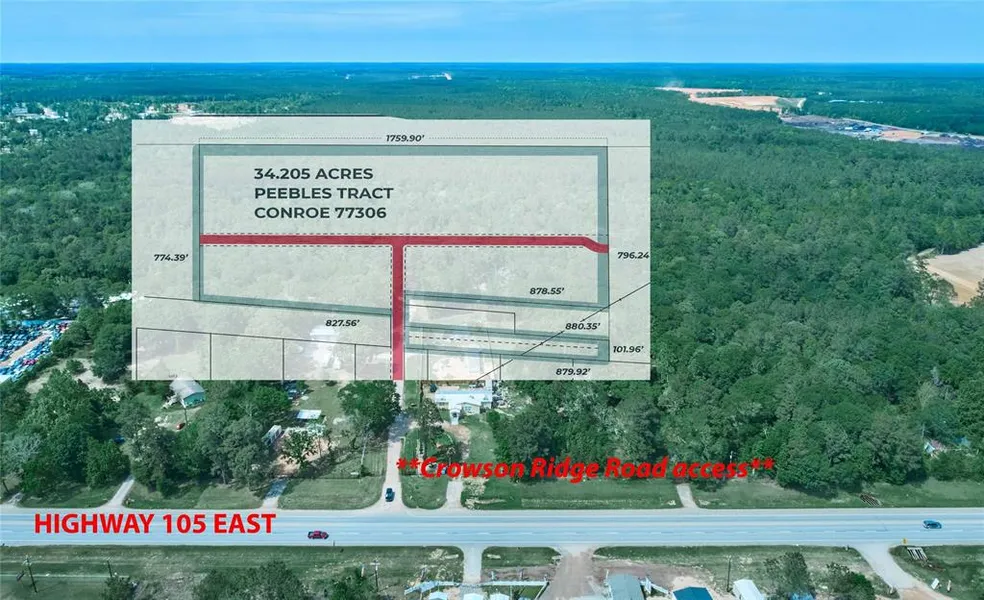 34+ acres, high & dry, out Hwy 105E. Easy access at Crowson Ridge Rd. Wooded with accessible interior road. Ready for your Commercial Business or Residential Community project! Fastest growing part of Montgomery County, along Hwy 105 East. Adjacent to residential development under way, growth all around. Only 10 miles to IH45. 12 miles to Hwy 59. Near the intersection of the 77303/77306 zip codes. Accessible to Willis Waukegan Rd/1484/3083. 13.9 miles to Conroe Regional Airport. 41 miles to IAH. 41 miles to Sam Houston State. Fire Station, Walgreens, SFA Elementary (2M), Cut & Shoot City Hall and more, closeby on 105E. Existing Survey Map & Metes/Bounds available. Very useable rectangular shaped tract. Online Flood Zone records classify this property as Zone X -- please confirm on your own. Trade area report shows 15,447 (2018) Hwy 105E daily traffic count . Text Listing Agent today for showing permission/instructions to avoid trespassing on neighboring property.
