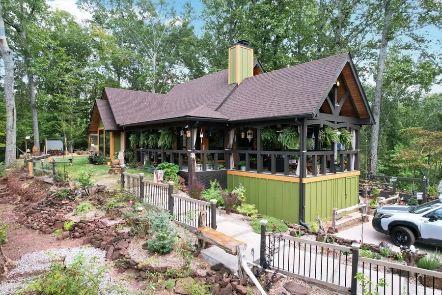 Welcome to your mountain-top oasis! This exceptional property encompasses over 15 acres spanning two mountains, offering unmatched privacy, year-round creek frontage, and stunning long-range views. Built just two years ago with natural dried spruce, this custom retreat blends high-end finishes with rustic mountain charm. The 2-bedroom, 2-bath home showcases an open floor plan with soaring tongue-and-groove pine cathedral ceilings and expansive Pella Impervia windows and doors that frame the breathtaking scenery. Each bedroom includes its own en-suite bathroom with Pfister fixtures and heatilators. The kitchen features quartz countertops and custom hickory cabinetry, while the living area is highlighted by a custom 42-inch wood-burning fireplace, set in one-piece leathered black granite and crowned with a black walnut mantle. Outdoor living is at its best with a wrap-around covered porch designed to double as an additional living space. Outfitted with TV and stereo wiring and custom weather curtains, it offers year-round enjoyment. Underneath deck is an unfinished basement, perfect for more storage area. Landscaped walkways, waterfalls, and garden areas and a fire pit complete the serene, spa-like atmosphere. Also included is a one bedroom/one bath guest house, large wired tool room, underground electricity, gated driveway entry, and a surround security system. Multiple cleared building sites provide opportunities for expansion. The property also qualifies for a greenbelt tax exemption, making it a smart investment as well as a peaceful retreat. Whether you're searching for a full-time residence, private getaway, or an investment rental this mountain-top sanctuary is truly one-of-a-kind. Schedule your private showing today and experience the beauty, privacy, and craftsmanship this property has to offer. Seller is offering home furnished or unfurnished. Please see below for more detailed information. Exterior Hardie board siding with lifetime warranty 35-year architectural shingle roof for lasting durability Custom weather curtains enclosing the entire exterior deck 2x6 exterior walls for added strength and efficiency R60 foam insulation for superior energy savings Solid wood interior doors throughout Interior trim crafted from natural beetle board for unique character 50-gallon high-efficiency water heater 26-inch concrete slab foundation for stability Security system for peace of mind Solar generator backup power solution Fully decked attic providing additional storage space