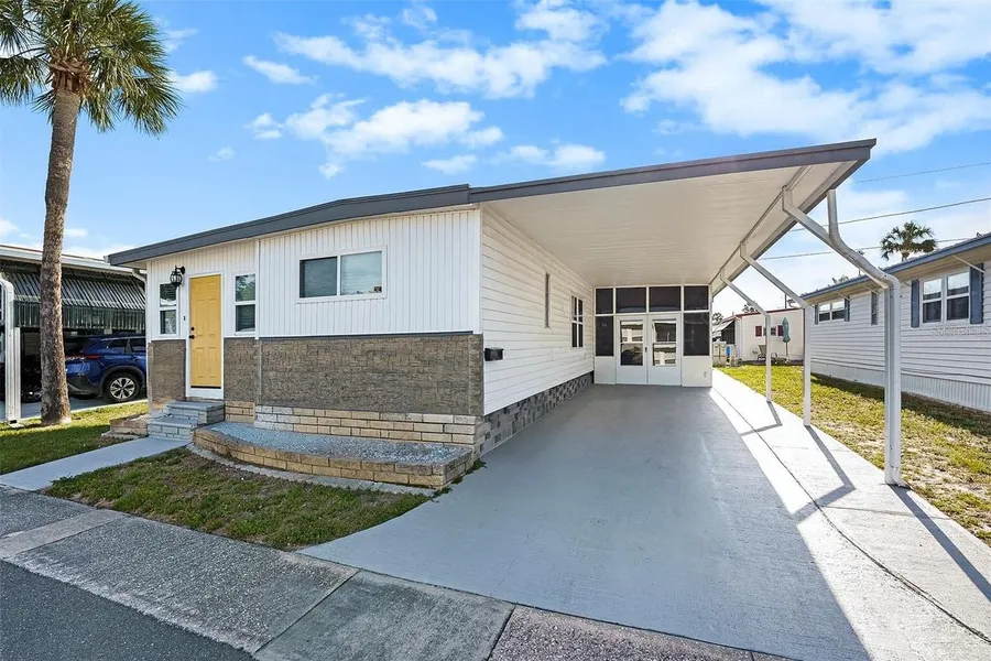 Welcome to your slice of paradise in the desirable Sunset Palms 55+ community of Pinellas Park! This charming two-bedroom, two-bathroom mobile home offers a delightful Florida lifestyle with numerous updates and fantastic amenities. Step inside through the inviting yellow front door and be greeted by a formal dining room, perfect for entertaining. Beyond lies a spacious great room, seamlessly blending the family/living area with an open kitchen featuring a cozy dinette. This home boasts significant upgrades for peace of mind, including new hurricane-rated windows and doors, a new membrane roof, and a new AC system. The exterior features attractive vertical cream siding accented by stylish stone fascia. Price includes the Share (valued at $55,000).