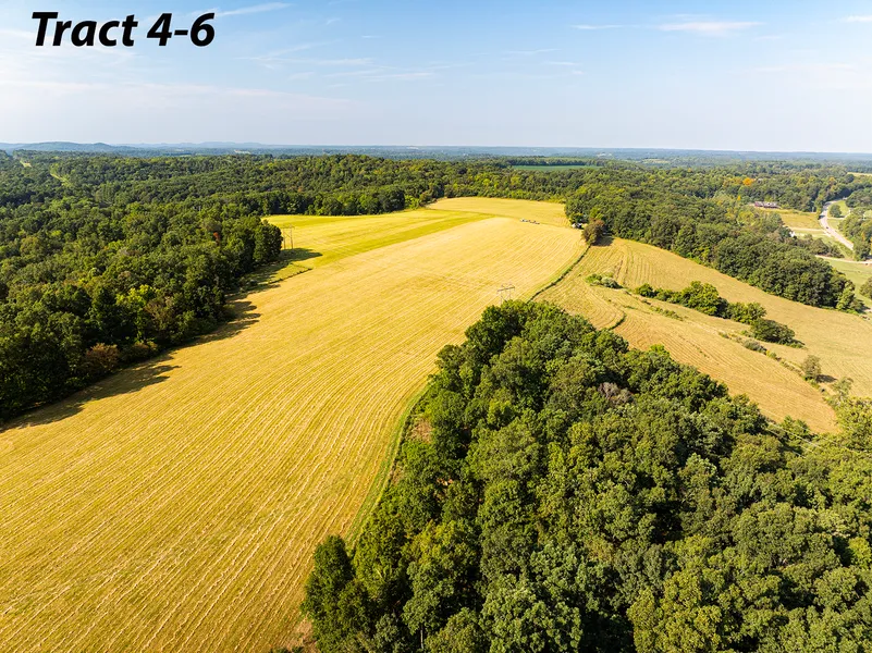 Tract 4: 104± ac containing both quality pasture & hay fields mixed with mature hardwood timber. The pasture all contains perimeter fencing. Consider the potential build sites atop the overlooking hill with beautiful settings.