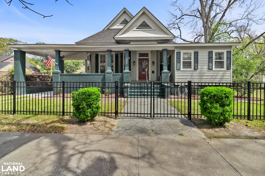 Nestled within the charming Historic District of Eufaula, this home features a brand-new privacy fence around the entire backyard, as well as elegant black metal fencing around the front. This home boasts soaring 13-ft ceilings, 4 bedrooms & 5 baths, a garage, luggage house, and potential guest cottage! The home features a formal dining room & living room, ideal for hosting gatherings & entertaining guests in style. The large modern kitchen, equipped with high-end stainless-steel appliances, and an additional dining area, seamlessly blends functionality with sophistication. A cozy loft accommodates 1 of the 4 bedrooms, complete with a full bath. This bonus living space is perfect for guests or extended family members.