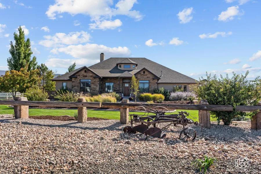 Discover this magnificent home in the coveted Equestrian Pointe subdivision, where luxury meets country living. Spanning 6,970 sq. ft., this stunning residence boasts 7 bedrooms, 4 full baths, 2 half baths, and a three-quarter bath, all set on 4.34 acres of beautifully landscaped grounds with panoramic mountain views. The home's exquisite features include a library, French limestone hydronic heated flooring, controlled lighting, a Sub-Zero refrigerator, and a butler's pantry equipped with a second dishwasher and sink. The fully finished basement, with its own private entrance, includes a full kitchen and offers two separate living areas, ideal for multi-generational living or rental opportunities. Outdoors, entertain with ease using the built-in barbecue and sink, and take advantage of 12 shares of water irrigation, perfect for a small homestead or cultivating the land. The recently revamped landscaping adds to the property's curb appeal. The standout feature is the 2,700 sq. ft. heated detached garage with a half bath, providing the perfect space for hobbyists or additional storage. Equestrian Pointe offers an array of amenities right outside your door, including a private playground, baseball field, volleyball and basketball courts, pickleball courts, pavilions, horse stables, and arenas. Embrace the lifestyle you've always dreamed of in this exceptional home.