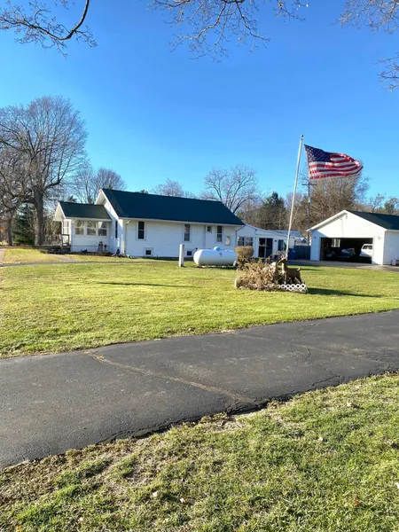 This beautifully maintained home features an open floor plan and 2 bedrooms, 1.5 baths, offering comfort and functionality throughout. The bright kitchen includes a large island, ample cabinet space, and a walk-in pantry, perfect for all your storage needs. Convenient main-floor laundry adds ease to daily living. A den currently being used as an office, provides additional workspace, while the spacious family room with a cozy fireplace is ideal for relaxing or gathering with guests. The finished basement offers potential for additional living space, hobby areas, or recreation. Outside, you'll enjoy a great outdoor space for entertaining, a 1-car attached garage with extra storage, plus a detached 2-car garage for vehicles and additional storage. A circle driveway provides easy access and ample parking. This move-in ready home has everything you need—space, storage, and modern convenience. Property sold as is.