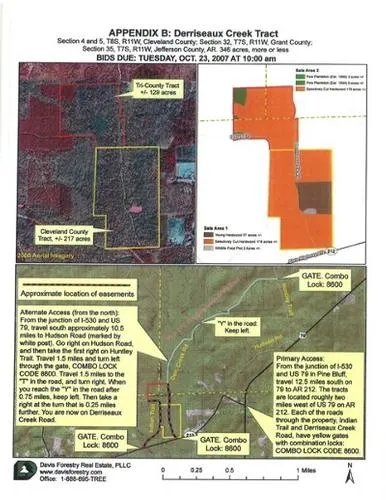 Research Parcel InformationAccess to the properties is excellent, and all access points are gated. Buyers will receive legal easements to the property from AR 212 via Derriseaux Creek Road and Indian Trail as identified on Appendix B. Primary Access - From the junction of I-530 and US 79 in Pine Bluff, travel 12.5 miles south on 79 to AR 212. The tracts are located roughly two miles west of US 79 on AR 212. Alternate Access - Properties can also be viewed from the north. For more precise directions, contact us and we will