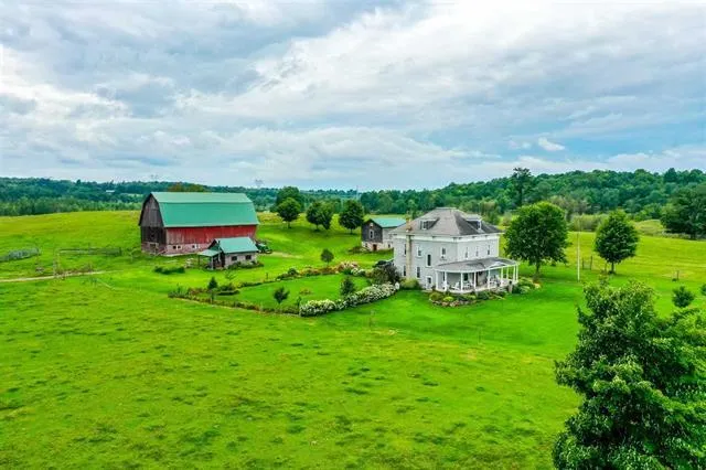 RARE HISTORICAL HAVEN IN A BEAUTIFUL COUNTRY SETTING ON 197 ACRES OF PRISTINE LAND - MUST SEE. The original homestead, barn, buildings, and stone silo date back to 1820! The main house was erected circa 1900 and is a 4 bedroom, 2 bath, wonderful example of exquisite old-world craftsmanship complete with American foursquare architecture. This home has all the luxuries for a modern-day lifestyle, yet all the charm of days gone by. Full of original period details including the wood flooring, staircase, moldings, doors, hardware, pocket doors, gorgeous chandelier converted from candle to electric, pendant light in the parlor, even a butler's serving cabinet that once opened into the formal dining room, and more!
