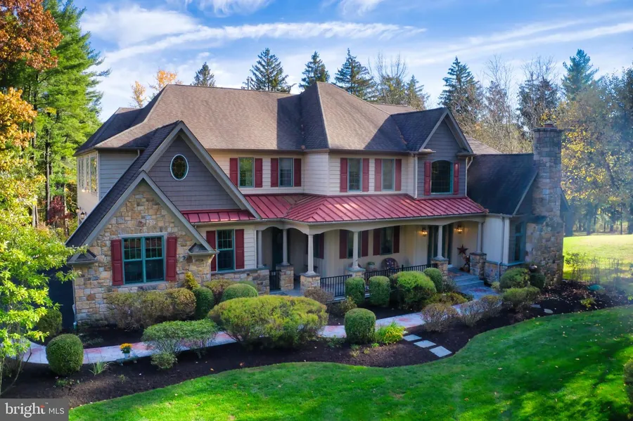 Plan to stay awhile when touring this charming 4 bed, 4.5 bath colonial home so you can see all the uniquely designed amenities inside. Waiting for you is this meticulously maintained 5,444 sq ft of glorious living space and a finished basement level. Feel at home in the serene 1.5 acre setting surrounded by beautiful nature and relaxing views, whether sitting on the deck, lower patio or covered front porch. Enter the soaring 2-story foyer and find the meandering butterfly staircase, hardwood flooring, fresh warm paint colors and French doors. Enjoy intimate conversations in the living room by the wood-burning stone fireplace or work comfortably and efficiently from home with privacy in your large home-office equipped with a 2-sided gas fireplace. Entertaining and cooking in this extraordinary kitchen will not disappoint. Prepare meals with ease at the oversized island with an extra sink for meal prep, a built-in Dacor double wall oven, five burner gas range, sub-zero refrigerator, a walk-in pantry w/prep fridge, custom cabinets, and loads of natural sunlight. Serve in the adjacent eating area, the formal dining room or how about in the sunroom where you will enjoy a breathtaking panoramic view of nature? The family room boasts a vaulted ceiling, gorgeous built-in window seat surrounded by built-in book shelving and a 2-sided gas fireplace offering yet another cozy place to retreat or entertain. Upstairs find the primary bedroom suite with sitting room, double closet and dressing room, luxurious bath with jetted tub and oversized walk-in shower. There is an additional guest suite and two more bedrooms with dual entrances to the shared bath. The bonus room on the 2nd floor is perfect for walk-in storage and there is a laundry chute conveniently located in the hallway that allows you to drop dirty clothes right to the large first floor closet that sits within the laundry room. The walk-out finished basement includes a large 4th full bathroom and ample additional space for fun and games, storage, and movie time. Located close to schools. Explore beautiful Bucks County with easy access to Doylestown, New Hope, and Chalfont for dining, shopping, and area parks. This one is ready for you, so schedule your tour today!