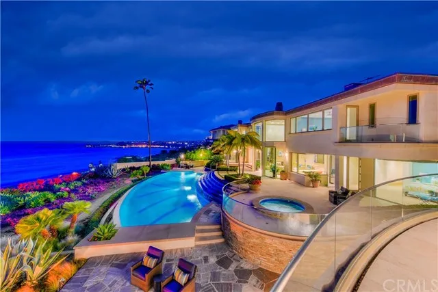 ABSOLUTE AUCTION, WITHOUT RESERVE: LIVE AUCTION ON DEC. 2ND, BY DECARO AUCTIONS INTERNATIONAL: OCEAN BLUFF FRONT 2+ ACRES OF PRIVACY: Expertly designed by award winning architect, Chris Light, this CA Contemporary home optimizes the panoramic ocean views from every inch of the private 2+ acre estate. The coastline views are endless & the Sunsets magnificent. The spacious 9100 sqft main house has a generous & open floor plan w/ 2 stories of curved glass facing the infinity edge pool & the ocean beyond. The main level floor plan flows effortlessly from entertaining spaces such as the impressive living room & adjacent bar to the expansive kitchen & breakfast nook, all with breath taking ocean views. Additionally, you'll find a private, ocean facing guest room with en-suite bath, & an entertainment/media room. The second level consists of a Master Wing (Master Bedroom, Bath, Dual Closets, Private Lounge & Executive Office) separate by a sky lit hallway from the Junior Wing (3 Bedrooms, Baths, & Jr Media Center). The detached ocean front casita at 850 sqft can be a guest house, pool entertainment area & bath, or as currently shown as an executive office w/ a meeting space below. There are 6 garages, 3 as part of the main house & 3 additional in the 2-story detached garage w/ 600 sqft Gym which includes Free Motion commercial grade equipment (10 stations). Additional: 800 bottle wine storage, 59 solar panels, BBQ Area & Fire Pit.