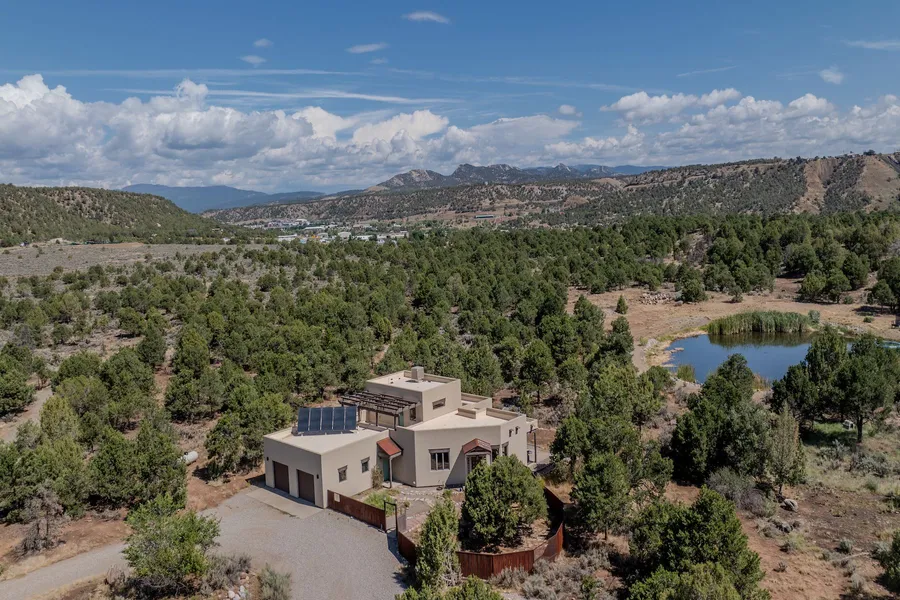 Discover the perfect balance of Southwest character and modern design in this stunning home, set on 13 private acres within the coveted Deer Island Preserve. Just minutes from town yet worlds away in feel, this property offers access to the Animas River, a shared pond with a sandy beach, and unmatched privacy surrounded by nature. Every detail of this home has been thoughtfully curated. Heated stained concrete floors and expansive windows fill the interior with warmth and natural light, while the open-concept kitchen is truly the heart of the home. With granite counters, a butlers pantry, a wine fridge, and a layout built for entertaining, it flows seamlessly into dining and living spaces that invite relaxation. One living room frames big-sky views through picture windows and features a cozy corner wood stove, while the other opens to a private patio designed for evenings under the stars. The primary suite on the main level is a retreat of its own, with a spa-inspired tiled shower and a generous walk-in closet. A second bedroom and full bath complete the downstairs area, while upstairs offers even more possibilities: a guest suite with a steam shower, plus a flexible open room that can serve as an office, workout space, or media room. Step onto the rooftop deck for sweeping southern views and nightly sunsets. Recent updates bring comfort and peace of mind, including a new boiler, water softener, LED lighting, speaker system, alarm with night vision, heated garage floor, and much more. Sustainability is built in, too, with a solar/thermal system powered by five panels on the roof and 18 panels on the shed, which help offset utilities. The garage has a new Tesla charger. Outdoors, youll find rock-lined walking paths, desert-friendly landscaping, and gardens framed by native trees. The shared pond is ideal for fishing, swimming, or paddleboarding, complete with a comprehensive sprinkler system for irrigation. To make this offering even more remarkable, the property comes with an assumable VA loan at just 2.9% interesta rare opportunity in todays market.