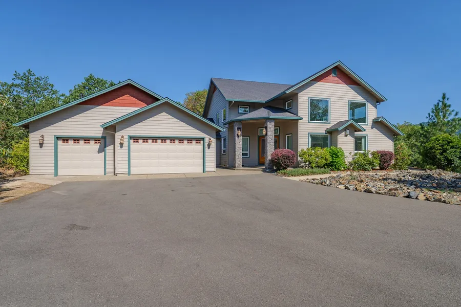Grand Country home on 7.47ac! This 2006 built, 3070sf Kirk Chapman home delivers soaring ceilings, spacious rooms, and a grand staircase. Decorative front door framed by two stone clad pillars opens to the large living room w/ a propane fireplace insert, floor to ceiling windows, & ceiling fans, w/ an adjoined dining room & office/den. A chef's kitchen features granite countertops, stainless steel appliances, double sink, & pantry. A comfortable main floor primary bedroom & en-suite boasts coffered ceilings, crown molding, walk in closet, jetted tub, water closet, shower w/ double heads, dual sinks, & slider leading to private back patio. Upstairs find lofted flex living space w/ gorgeous views, two additional bedrooms, & a bathroom. Large indoor laundry space. Attached 3 car garage with large bonus shop area. All this plus a, 1 bed guest cabin w/ full bathroom & kitchenette. Located a short drive to I-5 on a private paved road at the end of a cul-de-sac. Your private oasis awaits!