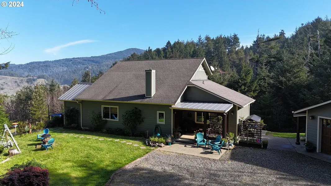 Stunning, elegant, ideal family or vacation home situated along the temperate southern coast of Oregon and just 9 miles north of the Rogue River. Offering breathtaking northwest views of the Oregon Coast including Euchre Creek, Sisters Rocks, and Humbug Mountain. The property boasts easy access to Hwy 101 while nestled off a tranquil county road, 155 feet above sea level and well outside the tsunami zone. The home features include a spacious view deck, and a meticulously maintained home on 5.2 forested acres for ultimate privacy and serenity. Originally constructed in 2001, it underwent a remodel from 2017-2019. Enjoy ocean vistas from the partially covered deck with hot tub. The beautifully landscaped grounds include a custom-built chicken coop with enclosed run, fenced raised garden beds, orchard, and an 8'x16' greenhouse. A drip system tends to flowerbeds and gardens. Additionally a detached two car garage offers a heated workshop, attic storage and the addition of a fourth bedroom/office with an en-suite bathroom and walk-in closet.