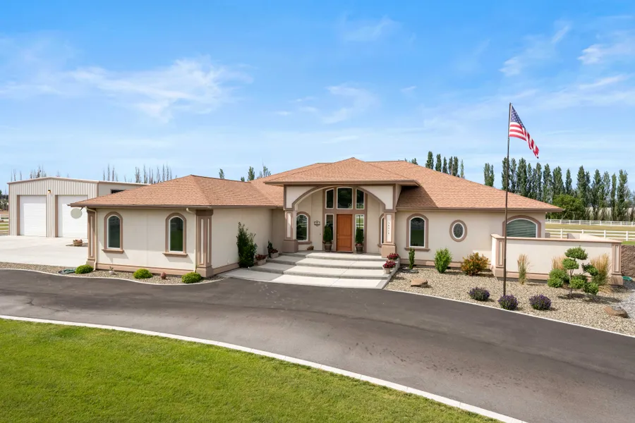This one-of-a-kind property gives you the lavish lifestyle you crave in a tranquil country setting, just minutes from town. Driving through the stately, lighted, block wall you approach up the circular drive. Open the door to stunning polished oak hardwood flooring with tile accents and arched entries to adjacent rooms creating an open feel. Fluted columns welcome you into the cozy, Formal Living Room with gorgeous, unobstructed bay window views of the yard, pastures & orchard beyond. The elegant 15 ft coffered ceiling height is perfect for that Spectacular Christmas Tree you've always wanted! Immense Gourmet Kitchen highlights the warmth and wonder of family time with generously sized island eating bar. High end stainless appliances include 48 in. 5 burner gas stove top with double convections ovens, Formal Dining Room with coffered ceiling features gleaming oak hardwood flooring with tile accents and a custom-built lighted display hutch. Owners Master Suite Retreat features 1500 sq ft of incredibly spacious luxury and comfort! French gliding door gives private access to the patio, which is plumbed and wired for your saltwater swim spa or hot tub. Lavish Master Bath, complete with dual vanities, loads of counter space and sumptuous custom cabinetry. The expansive Lower Level with tons of natural light from egress windows could become In-Law apartment, complete with massive, full wrap-around kitchen. 4000 ft Shop includes 2 huge 14 x14 ft overhead doors, easily store the largest RV with AC, insulated and plumbed for gas heat, wall of cabinets & workbench, heated hobby room, half bath, 200 amp elec service, 50 amp RV hookup & RV dump, separate septic system. Barn includes 5 stalls + tack room with 2, 20 amp elec services and water available inside. This property features 2 water sources; one from the KID which feed the community pond and a private 660 ft deep domestic artesian well that delivers 55 gpm for household use. The entire property can be watered from either source.