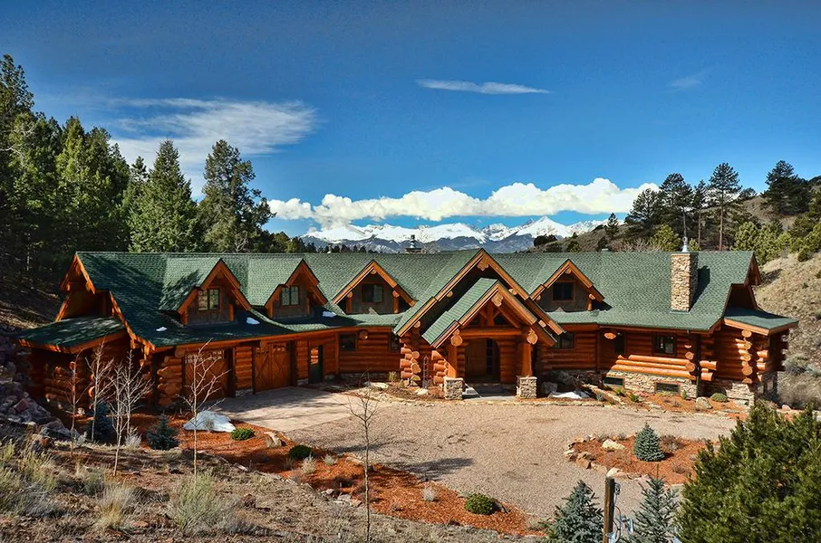 Private Colorado custom log home and guest house on 35 acres tucked at the end of the road. Pines, aspen, seasonal creek, snow-capped mountain views are just the beginning. 4 bedrooms, 4 baths with main level master suite. Alcove off master for sitting room, library or office. Gourmet kitchen with Dacor six burner gas cooktop, double convection ovens, large island and expansive granite counter top space. Dining room directly off the kitchen with a wall of windows with 180 degree views. Custom touches throughout include engraved concrete entry, wood carved doors, log stairway and chandelier just to name a few. Hearth room off the kitchen is cozy and welcoming with gas stove and wet bar. Laundry room with sink leads to nice size mudroom and over sized garage. Upstairs offers bedroom, office, full bath and two more rooms for bedrooms. Detached guest quarters above the garage offers suite with all amenities. Outdoor deck wraps the entire West side of the house where you can hear the creek and watch the sun set over the Sangre de Cristos mountains.
