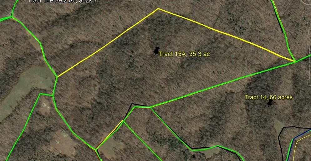 This tract (15A) is completely wooded and priced accordingly. Although it's close to several fields, there are no fields or food plots currently on the tract. You could put a cabin in the woods and hunt the hills and hollers at a low price! Accessed by a ridge top easement road, around a half mile from the highway and very private. Seller financing available with 5% down at 12% interest.