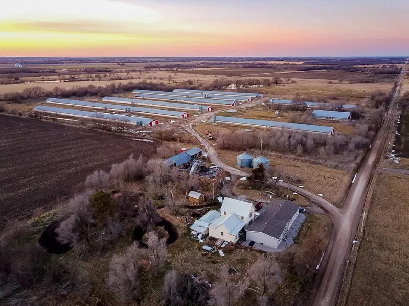 Midwest Land Group proudly presents this turn-key turkey production farm located south of Lockwood, Missouri in southern Dade County. This farm is a complete set-up, comprised of 8 grower barns with curtain sidewalls. The barns feature Chore-Tronics control panels, Chore-Time feeders, Plasson drinkers, Pro-Terra curtain controllers, and two PTO-driven backup generators. Additional buildings include a 7,000 square foot composter/stacking shed, 36'x88' machine shed, an old dairy barn (needs roof), and two 5700-bushel Butler grain bins. Sellers will include a full lineup of operating equipment and machinery, including two 4WD tractors, a skid-steer loader, litter handling equipment, rotary mower, barn sprayers, a grain auger, and a stockpile of supplies and replacement parts. The barns operate off of 2 wells (500’ and 625’), with rural water access for backup. The property covers 35 +/- acres, all of which are comprised of class II soils, with additional pasture acreage possible. This 35 acres includes the homestead, barns, outbuildings, and an old farmhouse (condition unknown).