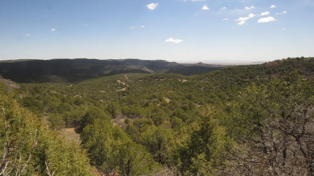 Pinon and Juniper covered ridge-top drops down into a valley with meadow and a seasonal creek bed.