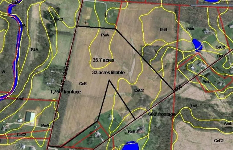 Nice piece of rolling ground with lots of frontage on State Route 656 and East Liberty Rd. This acreage is subject to the successful closing of the adjoining 16 acres. If not closed the total acreage with this listing shall be 52 acres and the price is increased proportionately. Great location.
