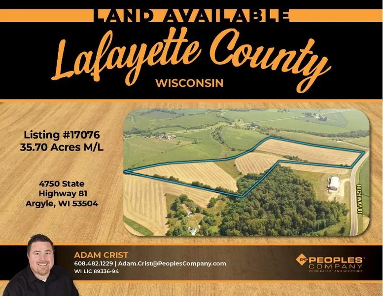 Lafayette County, Wisconsin Farmland Available - Peoples Company is pleased to present 35.70 acres in Argyle township. The farmland consists of 31.38 FSA cropland acres with an NCCPI rating of 67.4. The predominant soil types are Dodgeville silt loam and Ashdale silt loam. Currently, all farmable acres are leased out through the 2023 growing season.