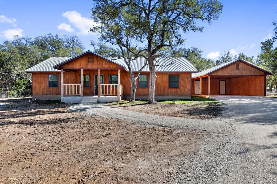 Darling floor plan and finishes. This 3 bedroom 2 1/2 bath home has a split bedroom plan, large living area and open kitchen and dining area. The porches are fabulous on both front and back of the house. There is a large 2 car carport connected to the home that offers an outside restroom and storage room. This new home also offers a metal roof. The home is tucked back into the trees and offers great privacy. Must See!!!