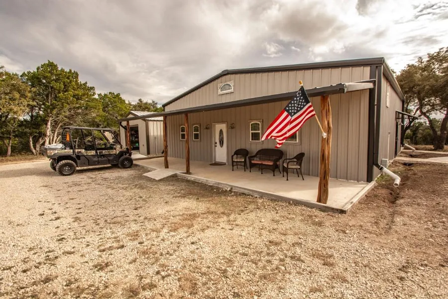 the ideal compound with county road access, excellent water well with filter and softener, limestone driveway, a custom 1600 square foot barndominium with full length porches both front and back, metal workshop, 1100 square foot metal cover with 40 foot 2 bedroom, 2 bath Camper that sleeps 6 complete with large wooden deck, rock patio with fire pit and manicured yard. The home was completed in 2021 and features a metal roof with thermo coating, spray foam insulation throughout home, 2 full bedrooms and custom baths,(wheel chair accessable master bath) upstairs 20x20 foot loft with sleeping area, large open kitchen/dining and living area, custom counters and cabinets, island and new appliances. The property also has separate RV cover with 50 amp hookup. The owner has selectively cleared areas of the property for hunting and access but the remaining areas have been left native for the large numbers of whitetail, hogs, turkey and occasional free ranging exotics. This is one of the nicest tracts available in this area, $575,000, call Chance Dean 830-278-0079
