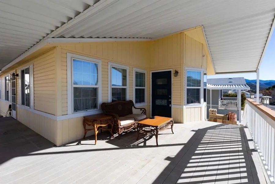 Welcome to this delightful residence, with breathtaking mountain scenery. This home features 2 bedrooms, 2 bathrooms and an optional 3rd/office with new laminate flooring, large windows for natural lighting, and high ceilings, adding charm to the living room and bedrooms. The kitchen is adorned with beautiful cabinetry, and a sunlit breakfast area. The primary suite boasts a luxurious bathroom with a walk-in soaking tub, a standalone shower, and a spacious walk-in closet. Extend your living space to the outdoors with a wrap-around deck, accessible from both the breakfast nook or the front entrance. Situated in a land-owned, rent-free, active community for those 55 and older, this home also includes a two-car garage with ample space for a workbench and additional storage, alongside a long and spacious driveway. Residents of Stone Ridge can enjoy various amenities, including clubhouse activities, a pool and spa, a well-equipped kitchen, billiard tables, a dance floor, and a large-screen TV. Savor the historic back-country communities, hiking trails, and wineries that are close by. The vibrant Temecula attractions are just a 30-minute drive away from all of this. Do not pass up the opportunity to acquire this charming getaway that expertly combines ease of use, comfort, and breathtaking surroundings!