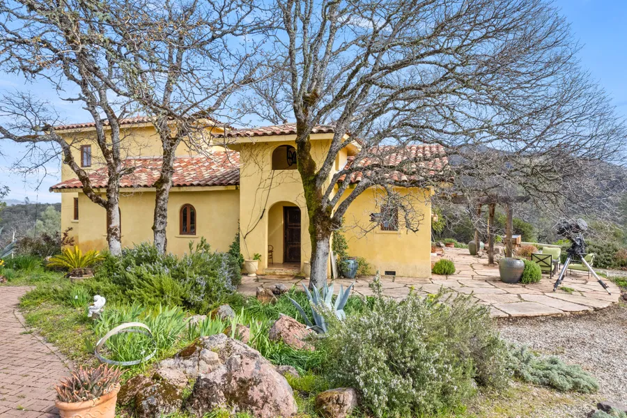 Incredible Tuscan Villa atop Mount Dali-Dona with incredible panoramic views. Set on 27± acres, and comprised of two parcels, the property hosts a 1.6± acre Rhone varietal hobby vineyard and a detached structure for the Talleyrand winery, already licensed and bonded. You will feel like the rest of the world disappears the moment you enter this property. As you make your way up the wildflower-lined driveway, the manzanita and mature oaks will welcome you to this incredible home. The residence is built with imported antique beams, French country-style kitchen with fireplace, quartzite counters, unique old-world aesthetics, heated floors, dual solar/PG&E power, and wood stove in the living room. The main home features 3 levels, 3 bedrooms and 3 bathrooms, wine cellar, large basement, formal living room, office, and walk-in pantry. Beyond the home, a fenced olive grove, raised bed garden and fruit trees and private hiking trails. This expansive yet cozy home is full of charm and has unparalleled views from every angle. Close to downtown Kelseyville, restaurants and shops. Borders the Clear Lake State Park with great hikes, lake access and camping. Secluded and peaceful, this property offers an incredible opportunity to observe wildlife and disconnect from the day-to-day hassle. ADU Potential.