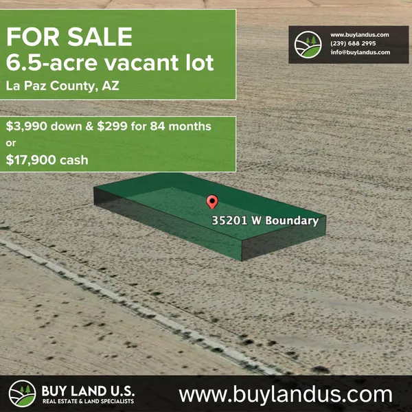For sale: Vacant lot in Bouse, AZ 85325. 6.5 acres, perfect for building your dream home or investing in real estate. Quiet neighborhood, stunning mountain views, and plenty of outdoor activities nearby. Purchase price: $17,900.