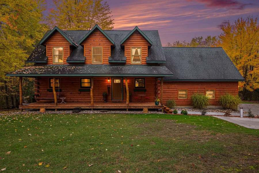 Beautiful Log home with many custom features, Stone fireplace with a dumb waiter for wood to come up from basement, hand carved trim features, granite counter tops, quality appliances 2 separate sinks in Kitchen, hard wood floors throughout most of the home. 3 bedroom 3.5 baths, beautiful views of the 10 acres from the cathedral windows or from the incredible deck, ample wildlife. Home has a closed loop Geo thermal heating system that is very efficient for heating and cooling. Basement is unfinished with a Fire Room for safe storage of personal items. There is an attached 2 plus stall garage, an unattached garage and a chicken coop. This is a must see home, use it for Family, hunting or a possible rental opportunity. See documents/ other for more info.