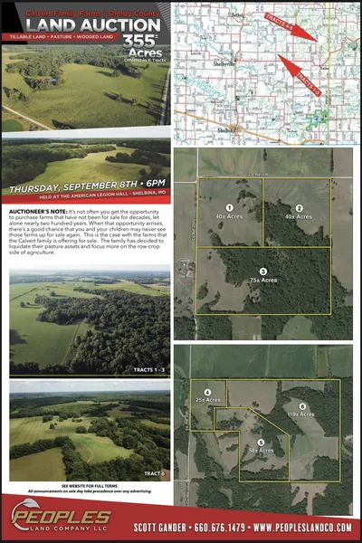 The Auction will be held live at the American Legion in Shelbina on September 8th at 6:00. There will be online bidding available through ProxiBid for your convenience. The farms will be offered at the Buyers Choice Method and NOT offered again in any combinations. Closing will be held on or before October 18th with American Title in Macon handling the Title Work.