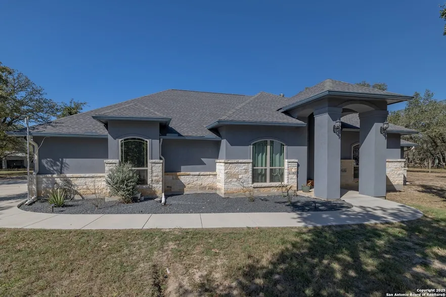 Welcome to the peaceful charm of Shannon Ridge, where this stunning custom-built residence sits on 2 acres of serene country living with easy access to town conveniences. Offering nearly 2,400 square feet, this beautifully designed home showcases an open-concept layout and thoughtful upgrades throughout. At the heart of the home is an impressive chef's kitchen, complete with an oversized 10x14 granite island featuring a breakfast bar, abundant storage, and a cozy dining nook ideal for everyday meals. The kitchen flows seamlessly into the spacious living area, where a stone wood-burning fireplace creates an inviting atmosphere for gatherings or quiet, relaxing evenings. Elegant ceramic tile flooring carries throughout the home for both style and durability. The primary suite serves as your private retreat, offering dual vanities, dual walk-in closets, a large walk-through tiled shower, and a rejuvenating jetted spa tub. Two secondary bedrooms and a versatile flex room provide options for an office, playroom, or formal dining. Step outside to unwind on the covered back patio, enhanced with patio misters for those warm Texas afternoons. The expansive 50x30 workshop is a dream space, complete with three roll-up doors for convenience and functionality. Additional features include vinyl tilt-out windows, radiant barrier roofing, full house water filtration system, salt-free water softener, cell signal booster, and a finished garage. The property is fully fenced, with a stylish wrought iron fence in the front to welcome guests and pets securely. If you've been searching for the perfect blend of comfort, craftsmanship, and country living - this home is the one. Schedule your tour and experience the beauty of Shannon Ridge for yourself.