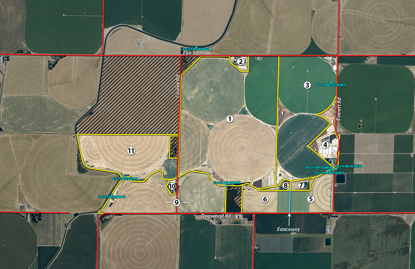 Tract 11: 92± ac containing 86.2 irrigable acres & a 4 acre feet/irrigable acre allotment correlating to irrigation parcel #016-113-002-03100-0. The tract possesses two Reinke Pivots & is majority Warden very fine sandy loam & Sagehill very fine sandy loam soils.