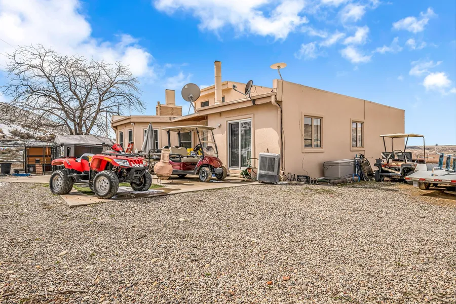Nestled in East Orchard Mesa between Colorado Cellars (Colorado oldest winery) and Sage Farms Lavender Farm, this home is truly a Palisade vineyard paradise! This property stretches over 6 acres with 2 acres of grapes. The grape vines are over 40 years old! Perched on top of a hill, this home has unbelievable views. Sit inside your inclosed patio while you enjoy your morning coffee and enjoy the picturesque views of Mt. Garfield, The Bookcliffs and The Grand Mesa. This home is an entertainers dream come true. The large kitchen features original wood cabinets, copper powder coated hardware, newer appliances and beautiful fixtures that fit the esthetic of the home. The kitchen flows into the dining, living and atrium space. The vaulted ceilings and beams create character in this home you will not find anywhere else. This home features two fireplaces, one in the office and one in the living room. The primary suite and bathroom retreat can be found on the main level along with the office. The walk out basement has a second bedroom and second bathroom. The garage has been converted into a work area with a kitchenette that can easily be converted back to a garage. There is a 7x18 wine room that can be used as additional storage or finished to create another room! Outside you have ample space for your toys that include a 15x15 shed and a large 30x50 metal shop. There are (2) 50amp and (1) 30amp RV hookups, a water hookup and sewer dump that is easily accessible. Being outside of the city limits, you have the opportunity for a short term rental without waiting! This slice of paradise wont last long, schedule your showing today!