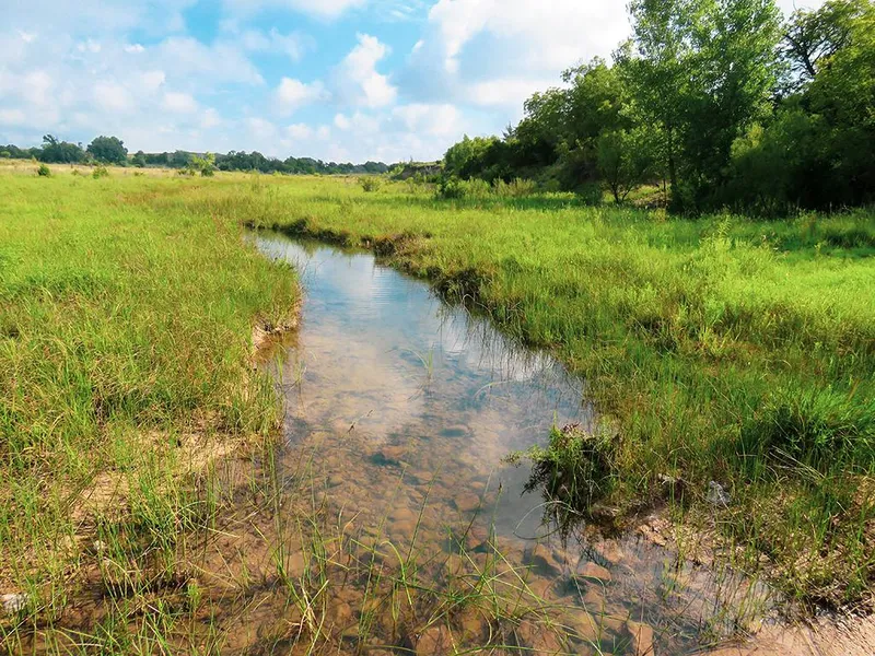 The ranch topography consists of mostly rolling native grassland with several scenic tree lined draws and creeks. One of the nicest features of the ranch is the two live water creeks that traverse the property. Elevations on the ranch range from 2,850 feet in northern portions of the property, to 2,640 feet in the southern creek bottom areas.