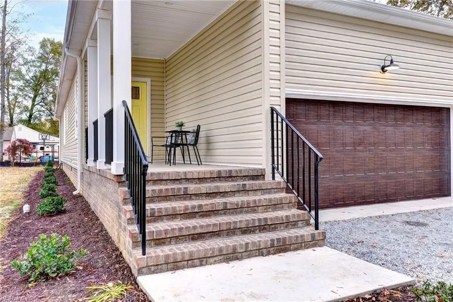 Introducing a Custom Home combines contemporary with traditional. This 3-bedroom, 2-bath home 1 level utilizes its 1,547 square feet of space with 9-foot ceilings, wide doorways, & an open-concept layout. The primary bath features a walk-in shower, while both baths have ceramic tiled floors & large linen closets. The flooring consists of lLuxury Vinyl Tiles. A feature of this property is the covered front porch, complete with custom made railings The kitchen has custom cabinets, an island with quartz counters, & SS appliances. Efficiency is enhanced by quality PELLA windows & sliding door. Each of the 3 bedrooms comes with ample closet space . For outdoor living, the rear covered porch offers a perfect space to enjoy the outdoors. The insulated finished 2-car garage provides great space and has a insulated high-end garage door. This home also comes with underground electricity, water, & sewer services. Located between RVA & Hampton Roads.
