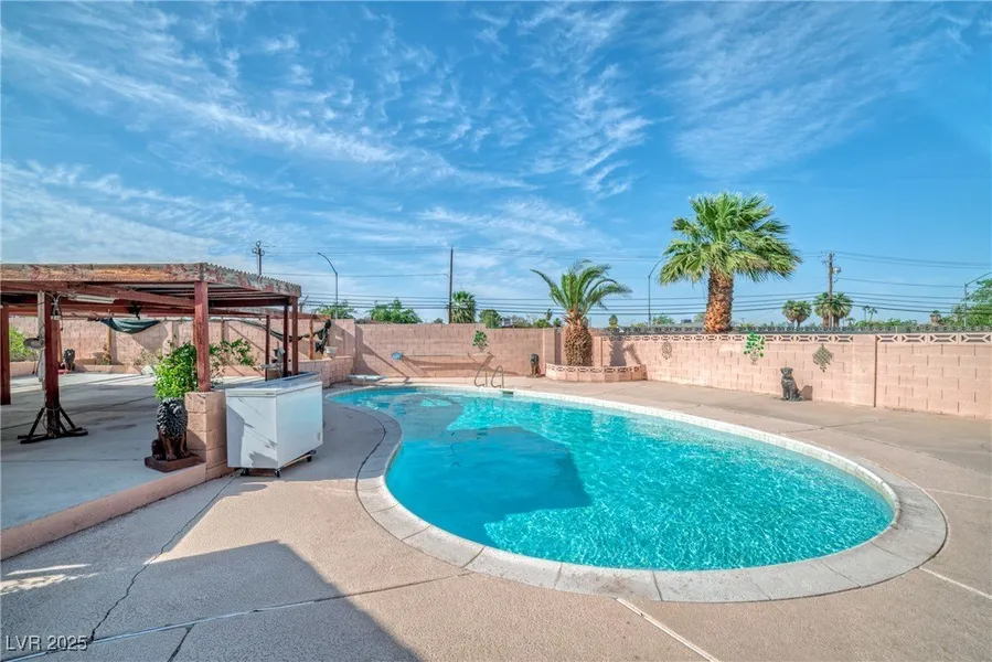 Move-in ready pool home with seller offering up to $10,000 in buyer credits for closing costs, rate buydown, or upgrades! This rare single-story on a cul-de-sac sits on nearly 1/3 acre and features a private pool that can be heated in winter, no HOA, possible RV parking, 4 bedrooms, and a 2-car garage. Almost 2,100 sq ft with separate living, family & dining rooms, freshly painted inside & out, and 18x18 tile throughout. The kitchen offers granite countertops & new stainless steel appliances. Spacious bedrooms, 2 fireplaces (1 wood-burning), secure front entry & possible sunroom. Huge backyard with new landscaping, 12x24 shed, garden area, approx. 2,500 sq ft covered patio, plus a new roof & garage sink. Conveniently located near shopping, schools, freeways & just 5 miles to the Strip. FHA & VA buyers welcome!