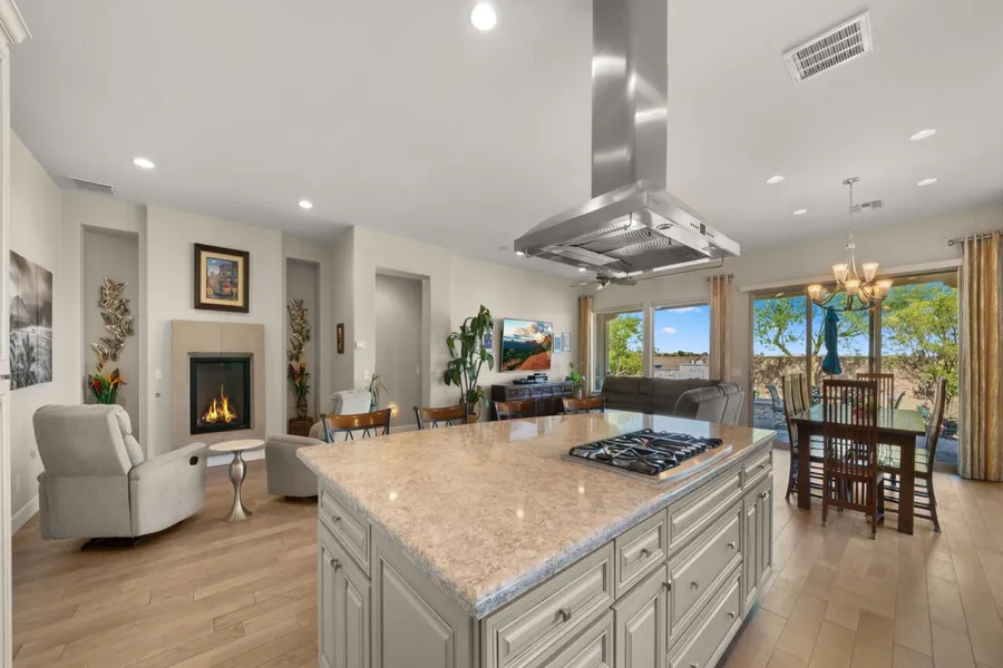 This residence is located in the prestigious Encanterra community, blending sophisticated design with resort-style living. The open concept great room with a cozy fireplace creates a warm and inviting ambiance, ideal for both intimate gatherings and grand entertaining. A chef's kitchen showcases premium stainless steel appliances, double ovens, gas cooktop, custom cabinetry, a large island with seating, and striking granite countertops. Sunlit dining and living spaces seamlessly extend to a private backyard retreat, complete with a built-in grill, custom fireplace, tranquil water feature, and pristine turf, all backing to open space for enhanced privacy and mountain views. In the extended garage you will find built in cabinets, work bench and epoxy floors. At Encanterra, residents enjoy a world-class lifestyle with a championship golf course, private clubhouse, fine dining, fitness and spa facilities, resort and lap pools, tennis, pickleball, and an active calendar of social events. If you are looking for a lifestyle where a golf cart is your daily driver, you've found "the one."