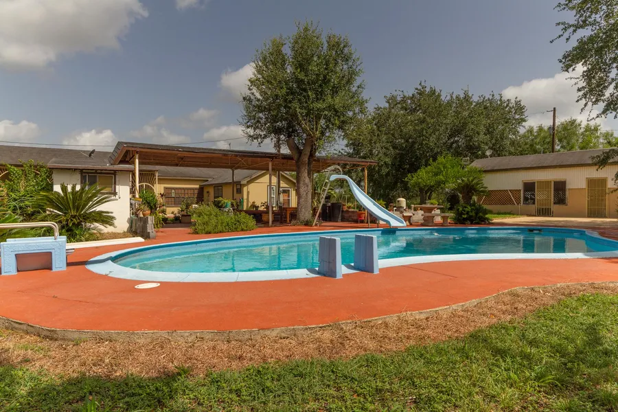 Surrounded by large properties on three sides, this hacienda offers lots of tranquility with a highly sought-after location just minutes from the city. Set up for livestock or farming with barns, equipment, and horse/cattle barn for your show string. Your backyard is a combination of huge mesquites and native brush with cleared pastures for livestock or farming. After a long day on the farm, hop in your pool to cool off. Complete with a covered BBQ area, bathrooms under a covered party area, and a screened-in porch.