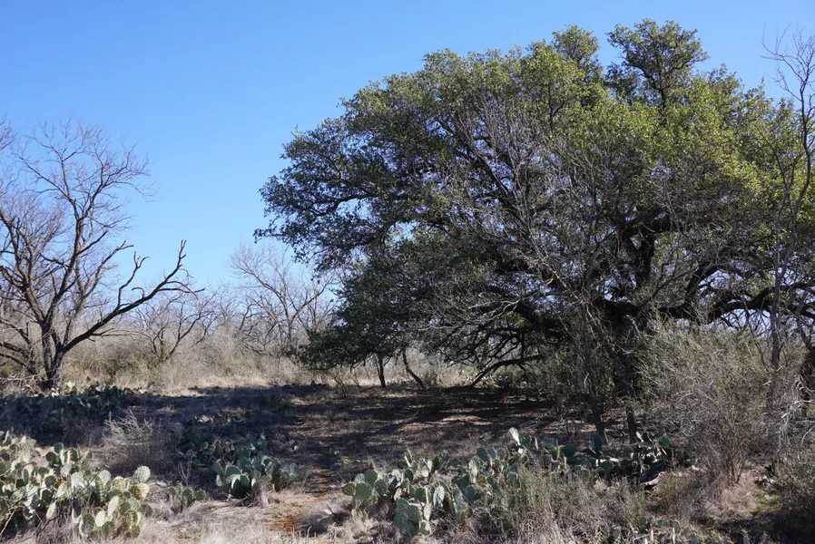 Terrain. The surface is gently rolling, with a shallow draw through the middle of the acreage. It has a heavy brush cover, with a few live oaks, and primarily mesquite, some cedar, and prickly pear.