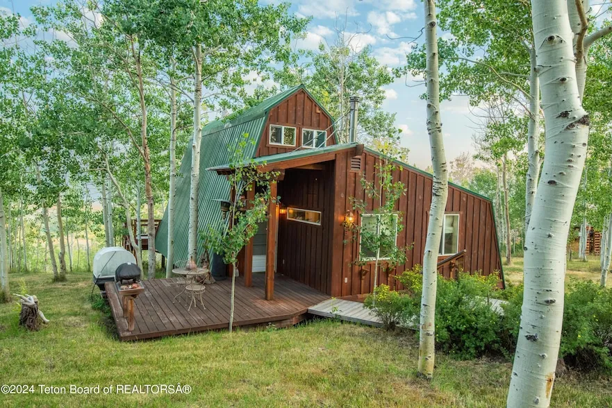 Whimsical mountain retreat with guest quarters, forest, and top-of-the-world views! Nestled in a grove of mature aspen, this home provides the get-away experience you've been craving. It blends well with the landscape and, in spite of some excellent views, is hidden from the view of the road and most of the surrounding countryside. The back deck is a birdwatcher's paradise. A detached garage houses a ground-floor apartment, laundry room, and an unfinished loft apartment. The highest elevation on this property stands above the house and provides commanding views of the Wyoming Range, Gros Ventre Mountains, and the Wind River Mountains to the east. This home is being sold furnished.